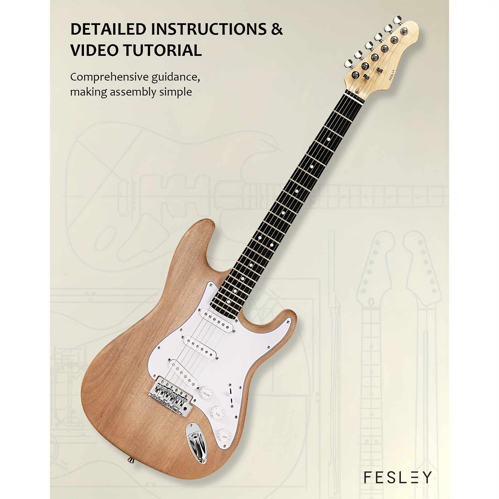 Fesley DIY Electric Guitar Kit, Build Your Own Guitar Kit with Poplar Body & Canadian Hard Maple Neck, ST Style, 6 Strings, SSS Pickups, Solid Construction, Fretboard Design, Natural, Music Craft Project, Home Guitar Assembly, String Instrument Kit, Instrument Builders, Hobbyist Musicians