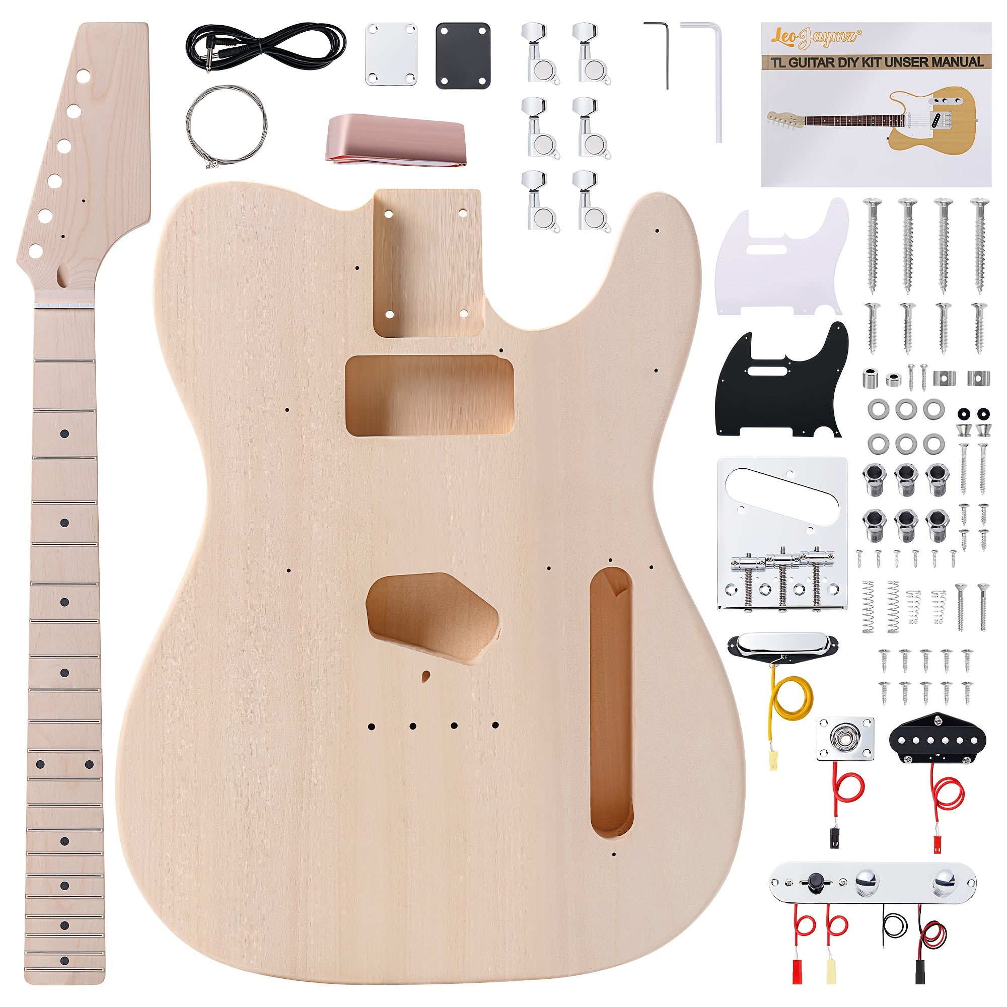 DIY kits for building a TL style electric guitar with a bolt-on neck. The guitar features a solid poplar body and maple neck, with all cavities pre-drilled for pickups and control knobs. It also includes a maple fingerboard with 6mm pearl dot inlay, 1 set of machine heads for a custom headstock shape, and all necessary wires, cables, and screws. The guitar has a 25.5″ scale length and a maple neck with 21 frets.