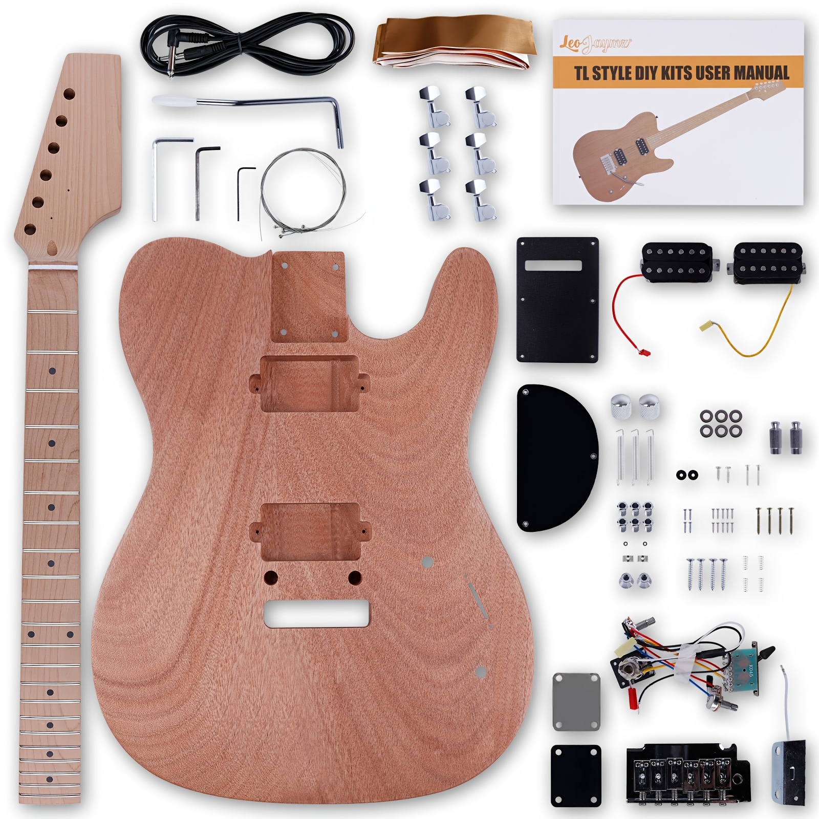 This DIY kit features a bolt-on neck TL style electric guitar with a solid mahogany body and maple neck. The stunning mahogany body has been meticulously polished and coated with a base varnish, saving the buyer the effort of painting the body. All cavities are pre-drilled for pickups and control knobs. It also includes a maple fingerboard with 6mm pearl dot inlay and 1 set of machine heads for a custom-shaped headstock.