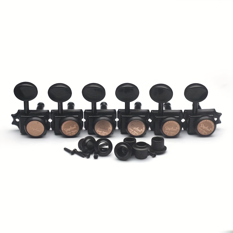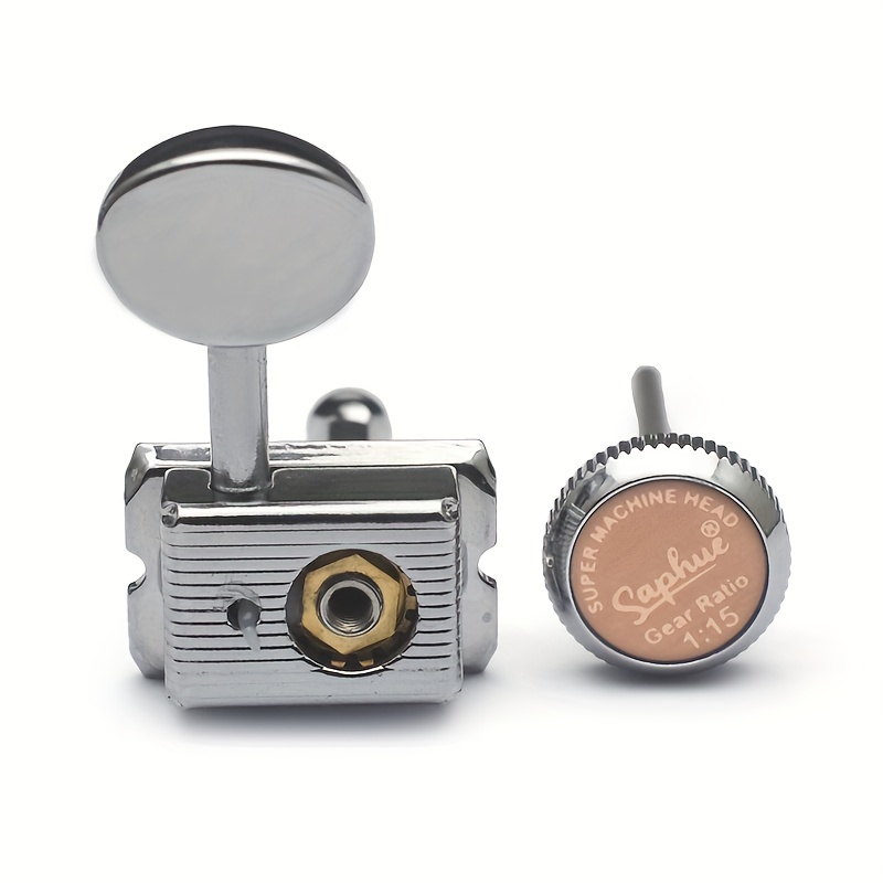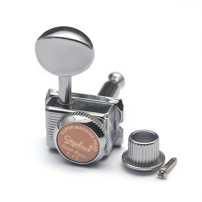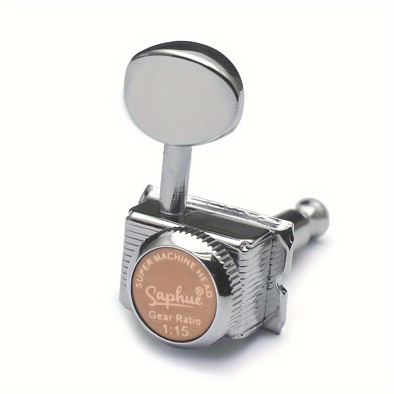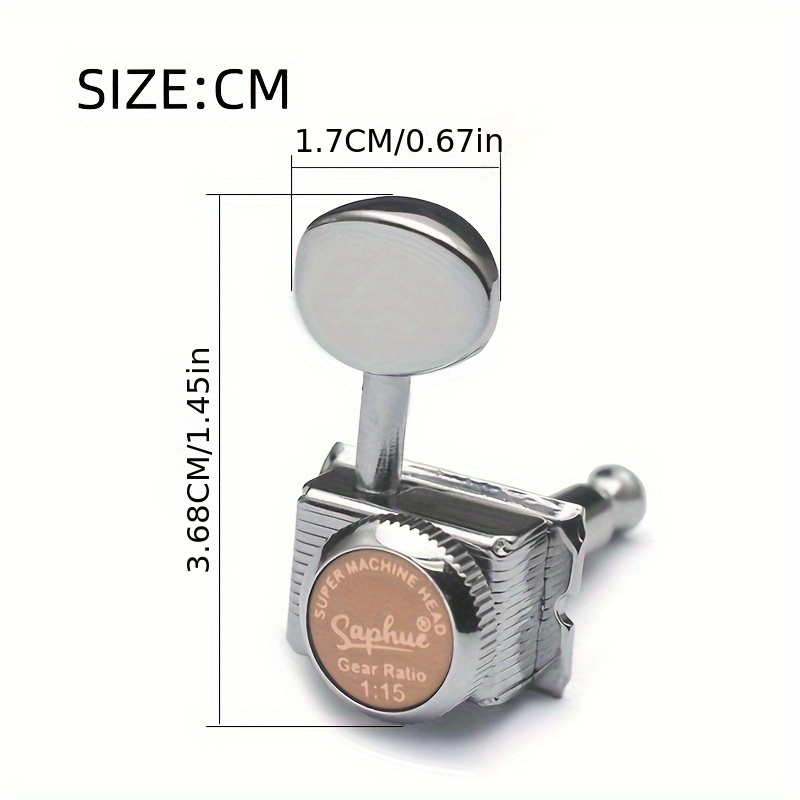 Characteristics: Completely new and of excellent quality. 1:15 ratio for 6 inline guitar locking string tuners featuring semi-open cast housings and metal knobs. Simple to install and replace your old or dirty guitar tuning pegs. Hexagonal button design with a sealed housing and a 45-degree fixing tag. Mounting hardware such as screws, bushings, and washers is included. Specifications: Material: Metal. Gear Ratio: 1:15. Position: 6R inline. Color: Chrome/Golden. Size: as shown in the image.